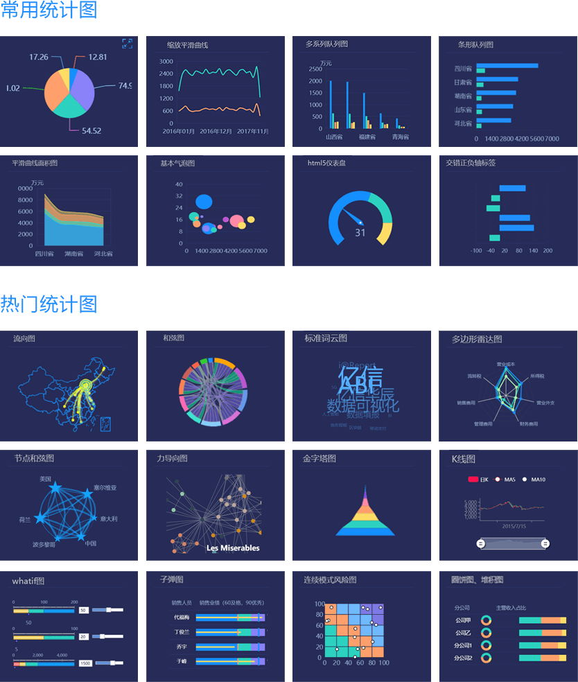 ABI采用JS、FLASH、HTML5三種技術(shù)自主開發(fā)統(tǒng)計(jì)圖,豐富的統(tǒng)計(jì)圖保證了其具有美觀的圖形展現(xiàn)能力,除了常用的柱狀圖、線狀圖、條形圖、面積圖、餅圖、點(diǎn)圖、儀表盤、走勢(shì)圖外,還支持和弦圖、圈餅圖、金字塔、漏斗圖、K線圖、關(guān)系圖、網(wǎng)絡(luò)圖、玫瑰圖、帕累托圖、數(shù)學(xué)公式圖、預(yù)測(cè)曲線圖、正態(tài)分布圖、迷你圖等,樣式包括2D、3D、EXCEL、AUTUMN、FLASH等;通過組合設(shè)計(jì)可以搭配處上千種視覺效果。