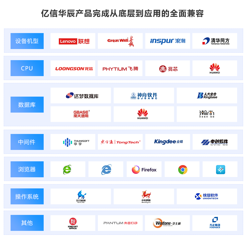 億信華辰旗下產(chǎn)品的開發(fā)框架、前后端組件、數(shù)據(jù)組件等,均采用自主研發(fā)完成,整體代碼自研率達(dá)98.3%,掌控核心技術(shù),輕松適配我國各類軟硬件平臺;并與與飛騰CPU、華為TaiShan服務(wù)器(鯤鵬平臺)、東方通應(yīng)用服務(wù)器、達(dá)夢數(shù)據(jù)庫以及銀河麒麟、統(tǒng)信操作系統(tǒng)等國產(chǎn)CPU、操作系統(tǒng)、整機(jī)服務(wù)器廠商的兼容適配工作,共同助推國產(chǎn)化進(jìn)程。