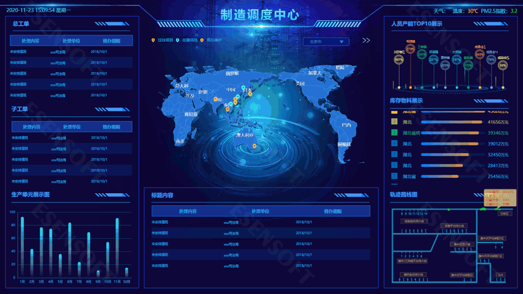 —TOP 4— 制度調(diào)度大屏 最佳分辨率:1920*1080 使用場景:工業(yè)4.0時代,制造業(yè)也開始積極響應(yīng)產(chǎn)業(yè)數(shù)字化的號召,融合大數(shù)據(jù)分析、3D地圖等技術(shù),構(gòu)建體系先進(jìn)、功能強大、場景豐富的制造調(diào)度指揮系統(tǒng),滿足了生產(chǎn)調(diào)度、應(yīng)急指揮、遠(yuǎn)程指揮、綜合決策以及企業(yè)宣傳等多種應(yīng)用場合。 展現(xiàn)邏輯:通過世界地圖一覽在建及歷史項目的運轉(zhuǎn)狀態(tài),方便售后維護(hù);另外對于制造中心內(nèi)的總工單、子工單、物料消耗、人員產(chǎn)能等指標(biāo)進(jìn)行充分直觀地展現(xiàn)。