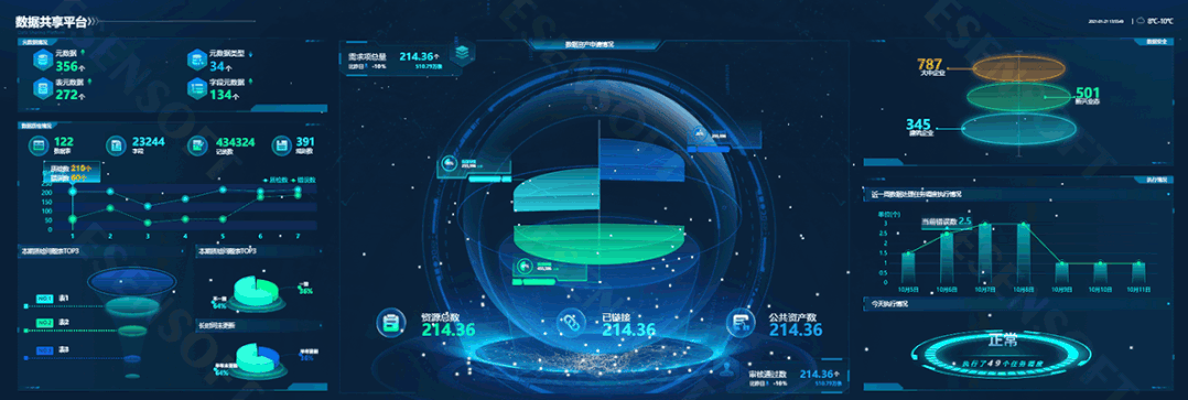 展現(xiàn)邏輯:實時展示數(shù)據(jù)資產(chǎn)申請情況、元數(shù)據(jù)情況、數(shù)據(jù)質(zhì)檢情況、數(shù)據(jù)安全、執(zhí)行情況等信息,并添加大量的動畫效果使其充滿科幻感。
