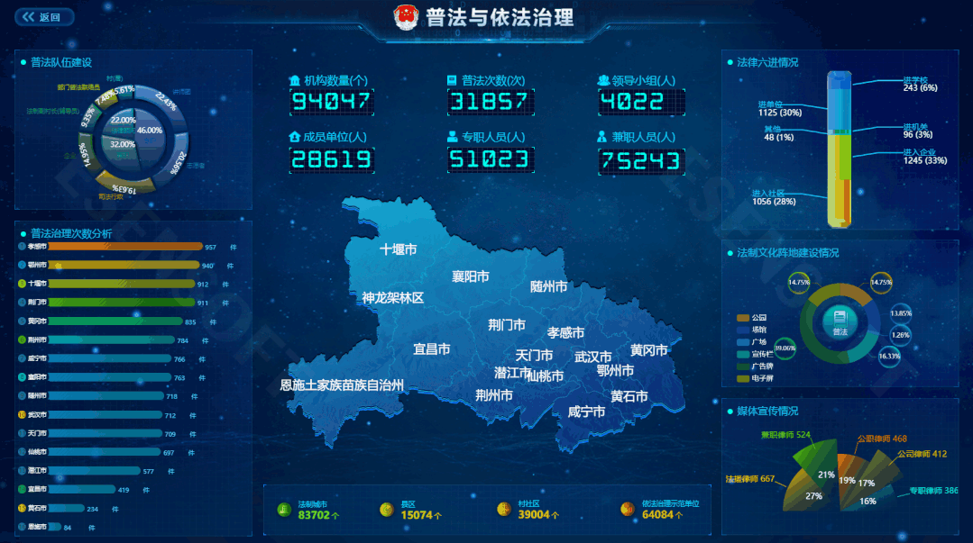 —TOP 2— 法制宣傳大屏 最佳分辨率:1920*1080 使用場景:了解普法工作的推進(jìn)情況,包括隊伍建設(shè)、媒體宣傳、各個縣市的大數(shù)據(jù)對比等,對于有法制宣傳,法律服務(wù)等需求的行業(yè)提供大屏承載方案,助其成為暢通社情民意、服務(wù)保障民生的監(jiān)管新陣地。 展現(xiàn)邏輯:使用樣式各異的圖表,展示法律行業(yè)內(nèi)的不同需求的數(shù)據(jù),根據(jù)地理位置等信息數(shù)據(jù),直觀、便捷的展現(xiàn)數(shù)據(jù)結(jié)果,讓人一目了然。